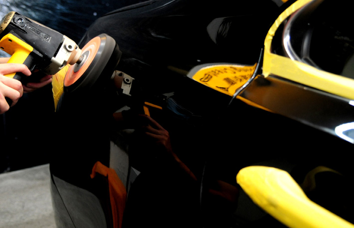 在平時的駕駛或風雨天中,漆面都會因與空氣中的粉塵或細小粒子發生摩擦而產生劃痕。處理車漆劃痕需進行拋光研磨(只有鍍膜和鍍晶才會有),把較深的劃痕修復成相對較淺的劃痕。研磨漆面首先需用膠帶把車框等處粘上,以免在施工期間損壞到車框。而施工時不同部位幾乎有相同的動作,或蹲,或站,或扎馬步,研磨工具應該怎樣拿?涂抹方式應該怎樣?等等,都是嚴格按照操作指導流程及經過專業培訓才可以達到嫻熟的程度,因為漆面研磨是一門很講究技術的工作,用力稍深,損傷漆面;用力較淺,難以修復;姿勢不對,研磨面積會變等等,因此,研磨技師們需經過專門培訓和嚴格考核方能擔此大任。另外,研磨的環境也很重要,如果看不到或看不清漆面的細微劃痕,即使再有技術的技師也無能為力,這就需要全方位安裝照明燈或在光線通透的環境下進行了。