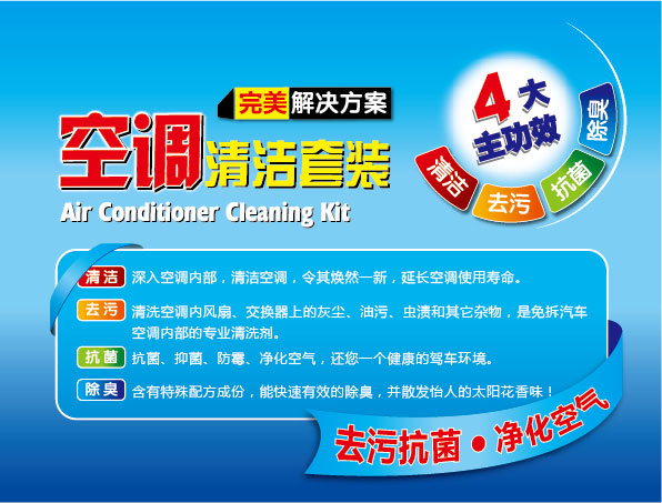 空調清洗劑:本品采用新一代技術及環保型原料精制而成,可深入空調內部,清洗空調內風扇、交換器上的灰塵、油垢、蟲漬和其它雜物,并散發怡人的太陽花香味!能有效的保養空調、除臭,延長空調使用壽命,是免拆汽車空調內部的專業清洗劑。